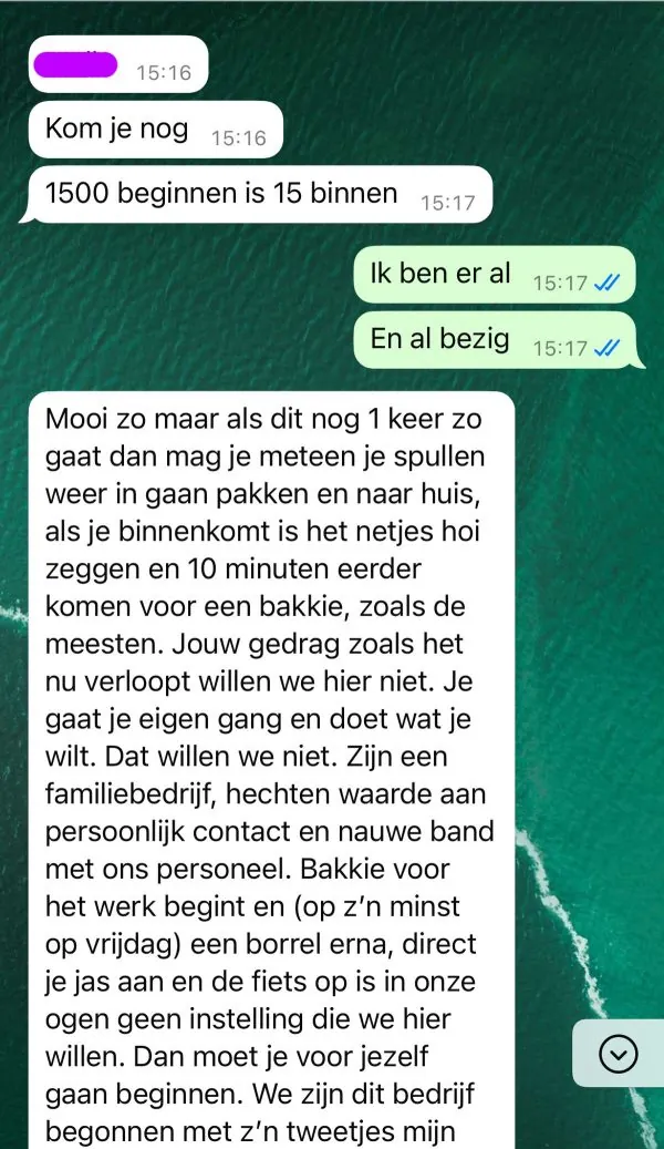 De toon van het bericht was duidelijk en streng. Er werd aangegeven dat het niet bijwonen van de borrel niet past binnen de bedrijfscultuur. Daarnaast werden ook andere gedragingen benoemd die volgens de werkgever niet aansloten bij de verwachtingen.