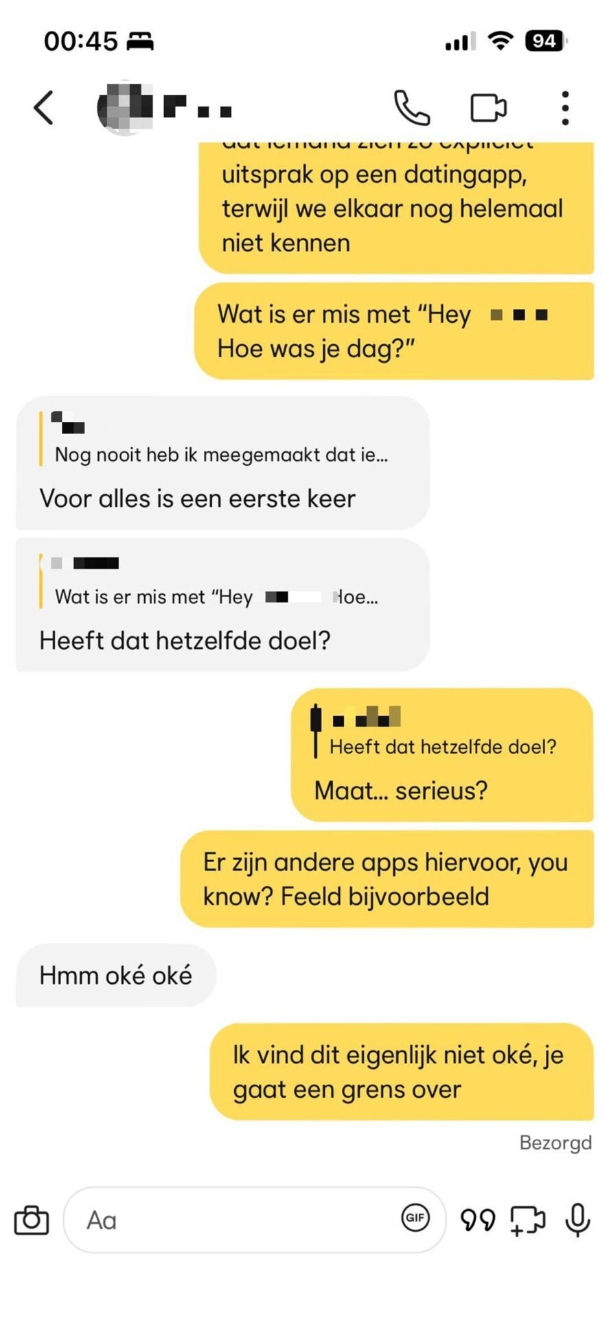 Zijn antwoorden gaven haar het gevoel dat hij zich totaal niet in haar interesse of persoonlijke ruimte kon verplaatsen. In plaats van een normaal gesprek te voeren, bleef hij zichzelf door de conversatie duwen met opmerkingen die steeds ongemakkelijker werden. Dit leidde er al snel toe dat de vrouw besloot het gesprek te beëindigen. Dit was helaas geen uitzondering, maar een veelvoorkomend probleem op dating-apps.