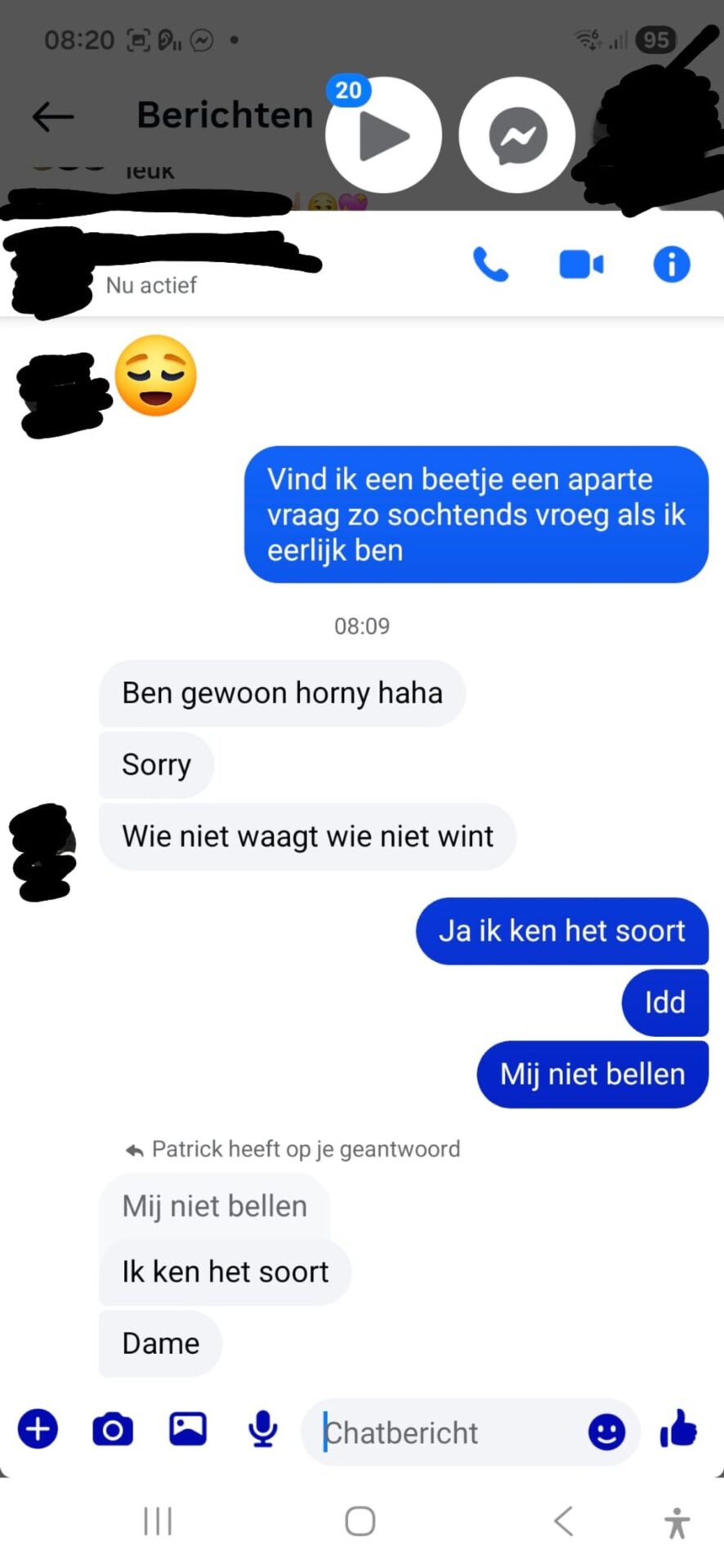 De vrouw ontving het bericht met enige verbazing. Ze keek op haar telefoon en vroeg zich af of hij serieus was. Dit was niet bepaald de manier waarop ze gewend was om ’s ochtends wakker te worden. Ze besloot rustig te reageren, maar het was duidelijk dat ze niet echt in de stemming was voor deze soort uitnodiging. “Ehm, het is pas 07:16… Misschien iets te vroeg voor Netflix & Chill?” antwoordde ze met een knipoog, hoewel ze het niet helemaal zeker wist of hij de grap begreep.
