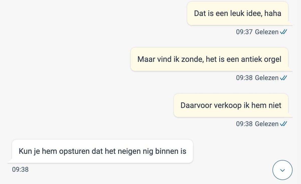 Jarno, die zijn plan niet wilde opgeven, bleef proberen de verkoopster te overtuigen. Hij legde uit dat hij het orgel slechts tijdelijk zou gebruiken, en dat hij het na carnaval zou restaureren. “Het wordt een geweldige blikvanger! Denk aan de aandacht die dit gaat trekken tijdens de parade. Ik kan het orgel weer in topvorm brengen na carnaval,” zei hij enthousiast. Maar de verkoopster was onvermurwbaar. “Ik verkoop dit orgel niet aan iemand die het wil gebruiken voor carnaval. Dit is een waardevol antiek stuk, geen speelgoed.”