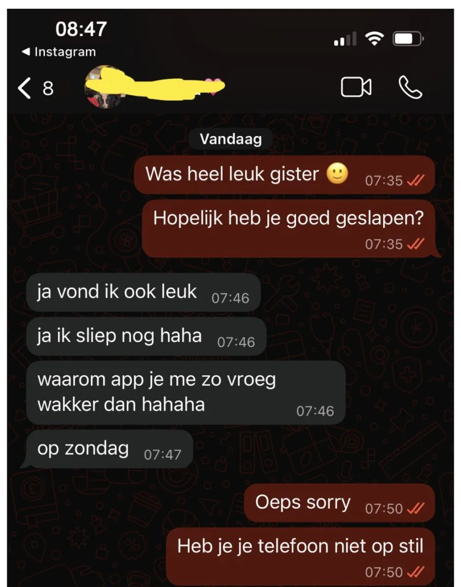 De reactie volgde kort daarna. Zij antwoordde dat ze het ook leuk had gevonden, maar gaf vervolgens aan dat ze nog sliep en vroeg waarom hij haar zo vroeg had geappt — zeker op een zondag.